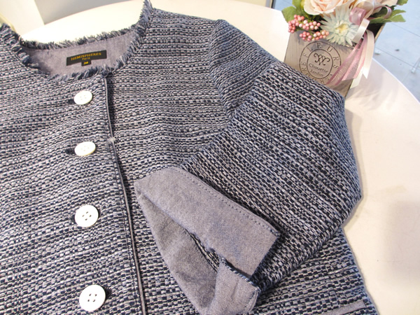 こちらは、ラメ糸が織り込まれた春のジャケットです。写真では、ラメが写りませんでした。それ程さりげない感じです。襟部分が、取り外し可能なので、雰囲気も変えられて重宝しそうです。春の卒業式や入学式にもお勧めです。