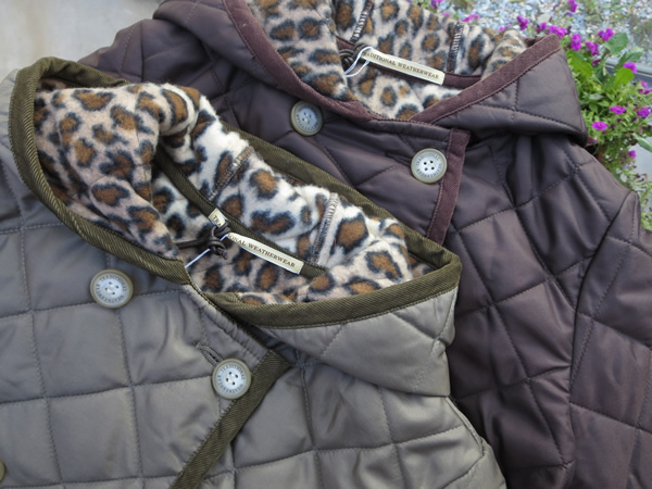 細身のAライン、ヒップ下の着丈など女性らしいシルエットのウールキルティングコート。フードがボディと一体になっているので、首周りはスッキリ。またコーディロイのパイピングがポイントです。裏地は、フリース素材のレオパード柄になっていて、なんとも可愛い雰囲気です。