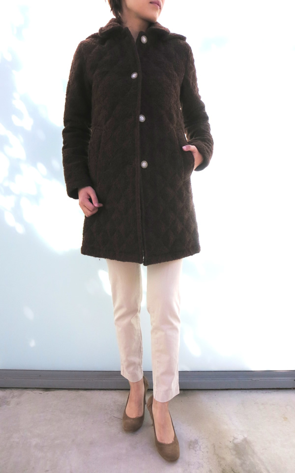こちらも同じく、ネップのウール生地で仕立てられたシングルボタンのキルティングコート。フードは、釦で取り外し可能ですので、いろんなシーンで着こなす事が出来ます。シンプルで、フェミニンな雰囲気が漂います。