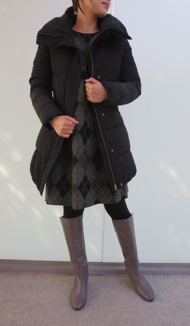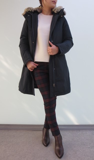 表地は、綿60%ナイロン40%の通称ロクヨンクロスと呼ばれる生地を使い、雨や水に強いと言われるデュポン社のテフロン加工が施してあります。インナーは、超温かなダウン仕様。ふかふかのダウンがたっぷり詰まり、極寒の寒さでも耐えられる最強のアウターです。着てみると、脇下から緩やかなAラインになるエレガントなシルエット。機能性もバッチリ、そして素敵に見える都会的な1着です!
