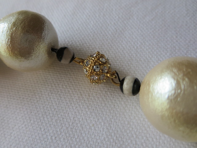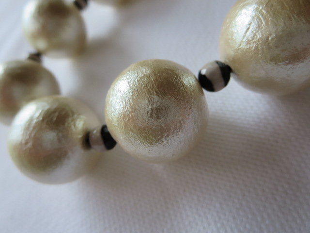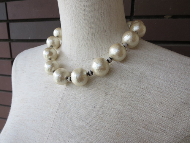 少し大きめなコットンパールが、印象的なネックレス。コットンパールの間には、ペイントが施されている天珠メノウという天然石が配置されていて、良いアクセントとなっています。コットンパールとは、綿を圧縮し、表面にパール加工をしたフェイクパールの事で、羽根のような軽さが特徴です。