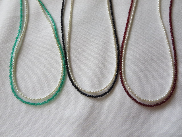 上のものと色違いのネックレスもございます。色が変わると、雰囲気も全く違って、爽やかでフレッシュな雰囲気。こちらは、マットなヴェネチアンガラスで、ホワイト&グリーン系の組み合わせ。