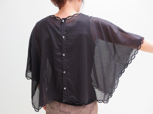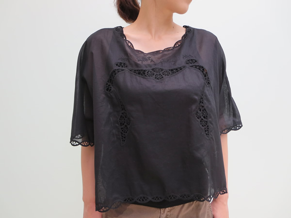 ビックシルエットのコットンブラウス。洗いざらしのようなシボ感と程よい透け感が、こなれた1枚です。ペイズリーのようなオーバル型にくり抜いたカットワークレースからチラリと覗く肌やインナーが可憐な印象です。