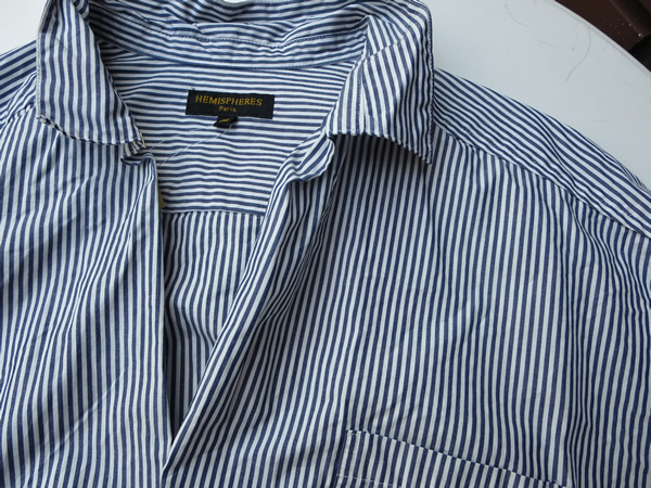 ストライプ柄のカシュクール風のシャツ。スポンと被るだけで、決まる便利なアイテムです。ボトムに合わせたパンツもとても薄手の綿ストレッチで、夏にはピッタリ。膝にタックが入って、付かず離れずの丁度良いシルエットになっています。