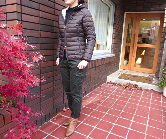 シックな印象で大人っぽいブラウンには、今のcachetteを彩ってくれている紅葉のような赤をコーディネートに持ってくるのが良いでしょうか。スポーティなフードタイプも、ミスティローズは女性らしい印象にまとめてくれますね。