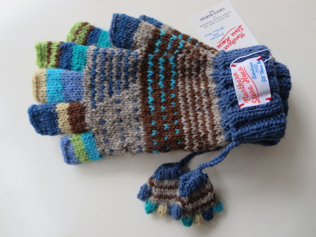 こちらも同じブランドのニットグローブ。カラフルな毛糸で可愛らしく編まれています。指先が出るフィンガーレスデザインで、身に付けたまま、手先が使えて便利!