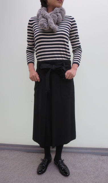 ボーダーのロンTをイメージしたウールのクールーネックニットにカフェのギャルソンのようなデザインのシンプルモードな雰囲気のスカートを合わせて、シックな着こなしに仕上げてみました。プレーンなクルーネックのトップスは、これからの重ね着シーズンにもピッタリ!スカートは、リボンを別のものに代えてお使い頂けば、シンプルで合わせやすいボトムとして着まわせます。