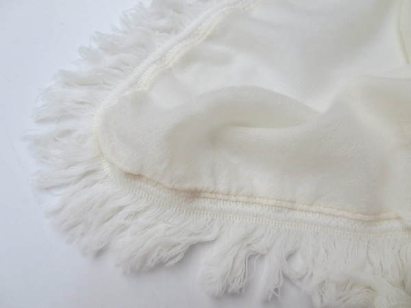 季節を問わず、【ホワイト】は魅力的なカラーです。どんなカラーにも負けず、優しく主張してくれますね。長めのフリンジが、大人可愛い雰囲気。顔映りも良いですし、万能タイプのストールです。