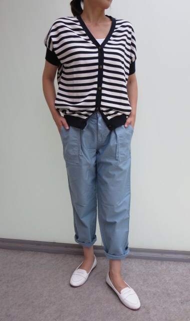 トップスのボーダーカーディガンもこれから使える5分袖デザインで、おススメ!1枚でサマになり、使えるアイテムです。後ろの切り替えやボタンもアンティークっぽくてお洒落ですよ!