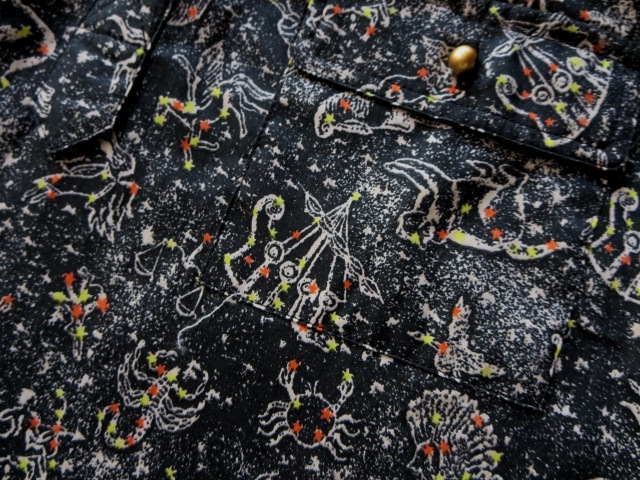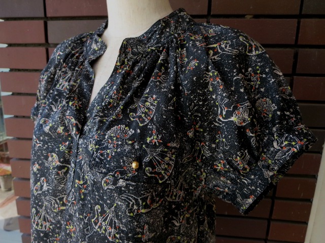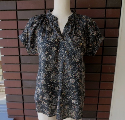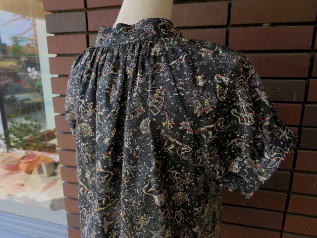 鈴のようなプチ釦を付けた胸ポケットがポイントになっているリバティ柄スキッパーブラウス。リバティ柄の新作「Kevin」。星座をモチーフした大人可愛い柄です。リバティ柄と言うと花柄が浮かびますが、ちょっと変わり種のこの柄もとても魅力的。ネック周りや後ろにもギャザーが入っていて、着て頂くと可愛らしい雰囲気に。