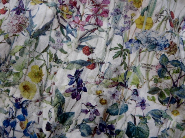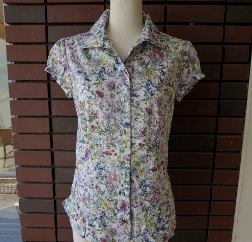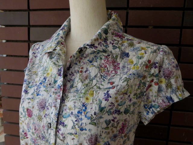 こちらもリバティ柄のブラウス。19世紀初期の「英国野花図鑑」のイラストを切り取り、インスパイアーして作られた柄です。繊細で大胆な野花のプリントは、白地に色とりどりの花が咲く涼しげな印象です。甘すぎず、程良くキチンとした雰囲気が、オンオフ使える素敵な1枚です。