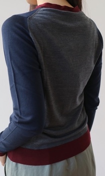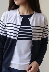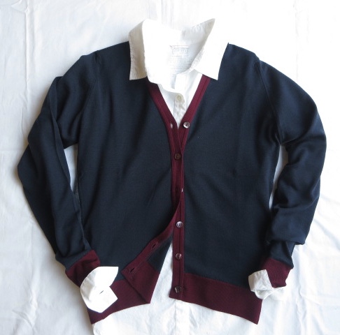 トリコロールカラーのカーディガン「A3840」。ネイビーベースですが、ボルドーのラインが全体をスッキリと見せてくれます。インにシャツを合わせても、ワンピースやカットソーにさらっと羽織っても全体のバランスが良さそう。