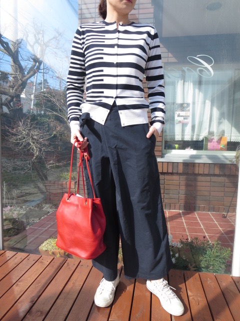 ストライプですが、こんなリズムならマリンとは違う爽やかな雰囲気で素敵です。コーディネートは紺パン(ワイドパンツ)に合わせましたが、ビジネスシーンにも着ていただけるかと思います。