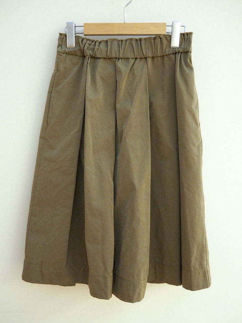 シャリ感のある厚地のポリエステル地を使ったきれいなフレアスカート。撥水加工を施したようなつるんとした無骨さと、フェミニンなシルエットの組み合わせが新鮮です。