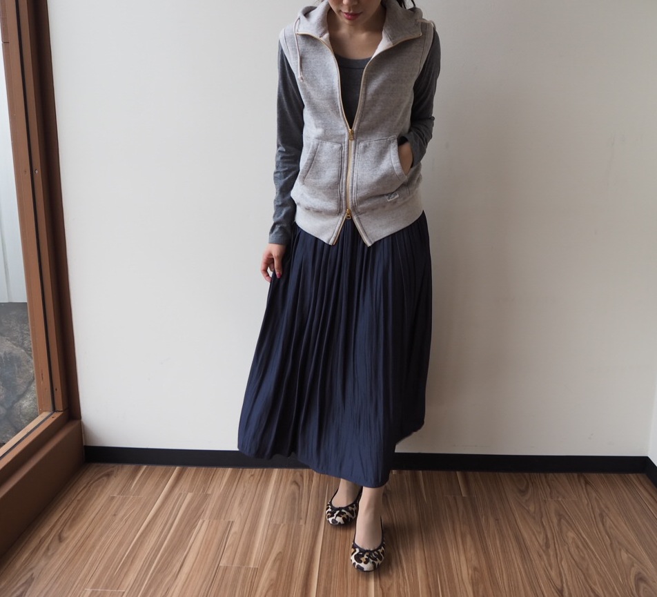 少し秋が深まってきたら、早速トライしてみたいコーディネートがこんな感じ。 グレイの薄手のカットソーにフェミニンなキャメルのダウンベスト、大人カラーの組み合わせで着用してみました。