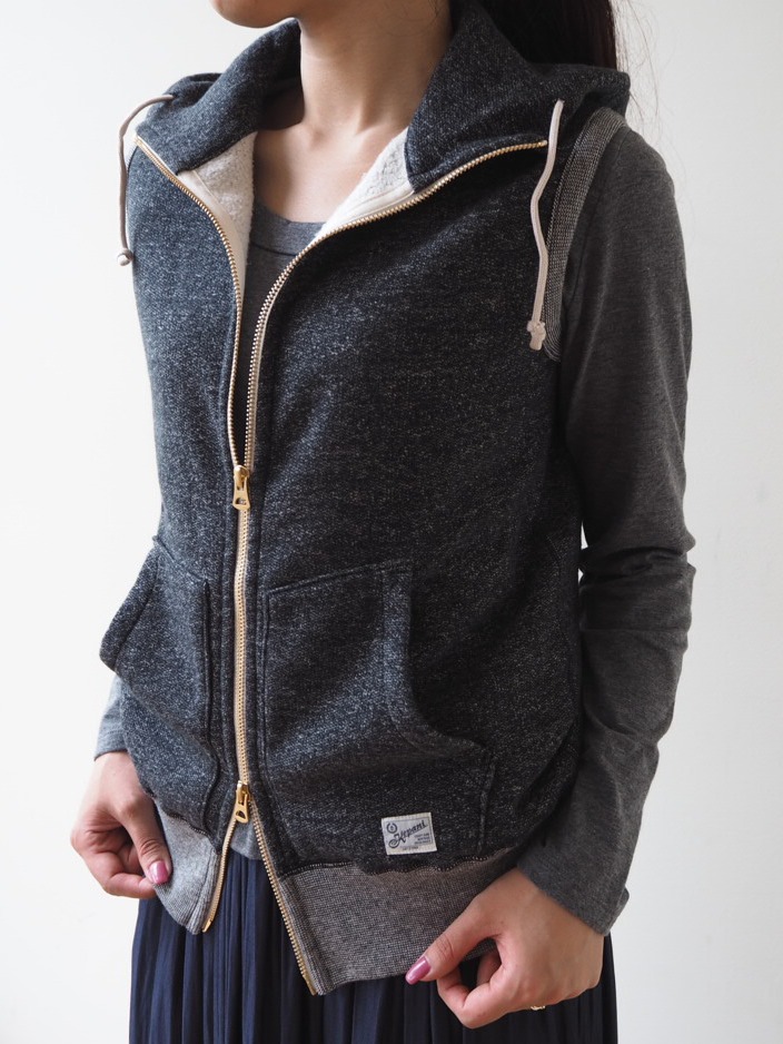 そして今すぐ着ていただけるのが、こちらのパーカーベスト「Brroklyn」。素材は上記「Manhattan-Ⅱ」と同ラインですが、お色はブラックとライトグレイのセレクトです。人気のワイドパンツやデニムに合わせていただくのは勿論、ボトムスを選ばない便利なアイテムですね。