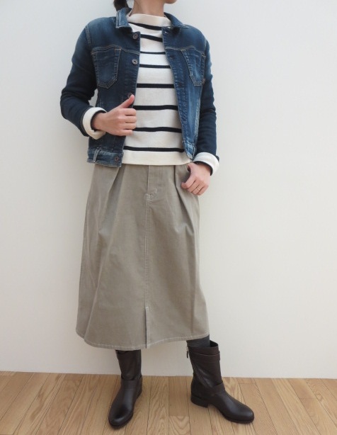 スカートに合わせてもこんなに素敵です。Wジッパーなので、スタイリングの際、腰回りに合わせ易いのも嬉しいところ。