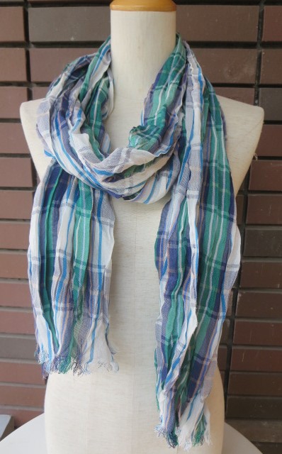 レーヨン・ポリエステル素材のチェック柄ストールも入荷しました。さらっとした肌触りが、夏シーズンにも巻きやすく、日焼け対策にも◎。左は、ブルー系のチェック柄。右は、グリーン系のチェック柄。