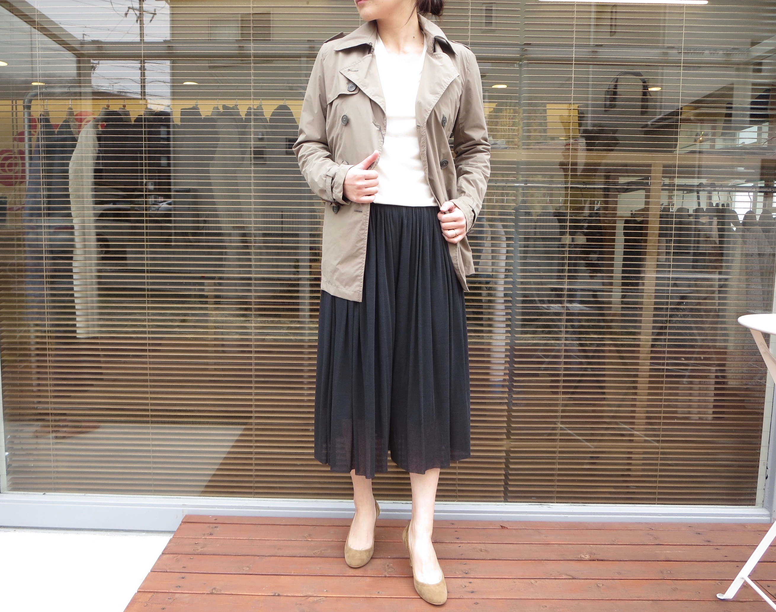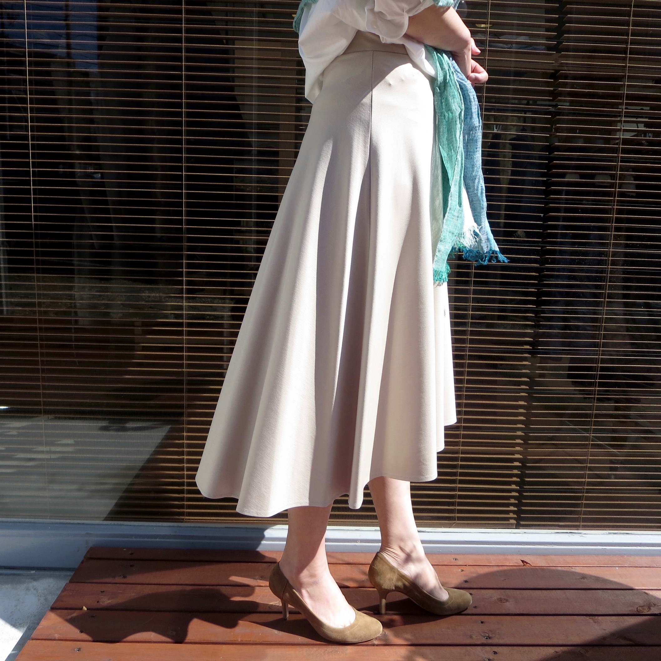 昨シーズンあたりから人気の長め丈スカート。ベーシックなベージュのフレアスカートですが、後ろ下がりのシルエットにするとこんな感じで全体のスタイルアップになります。