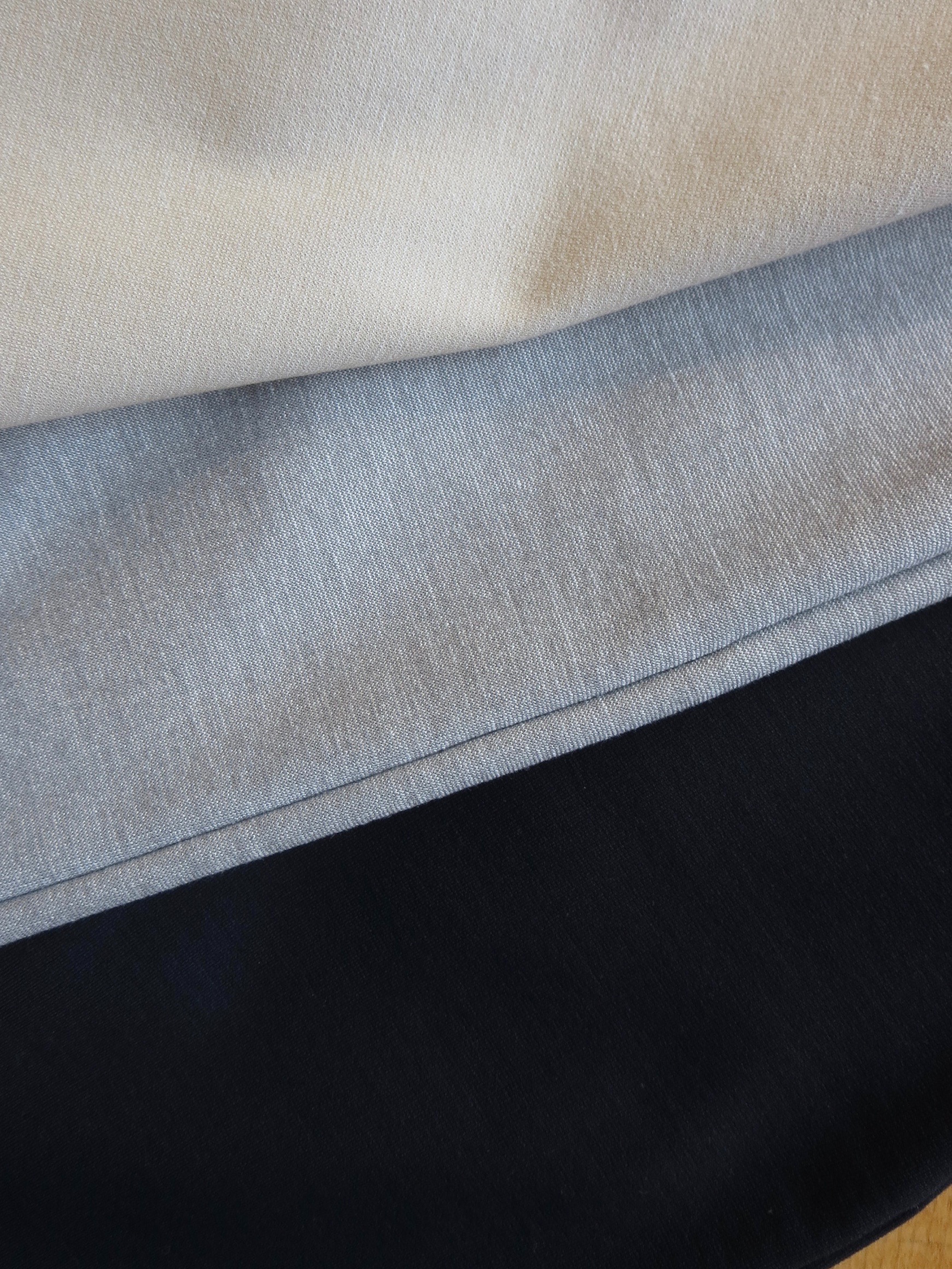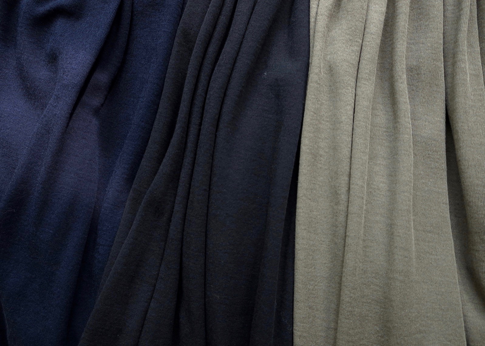 スカート丈は後ろ81cm、前が70cm。薄手のジャージ素材で、うっすらと織り模様が表情を出して。ベージュ、ネイビー、ライトグレーの3色でご用意しています。