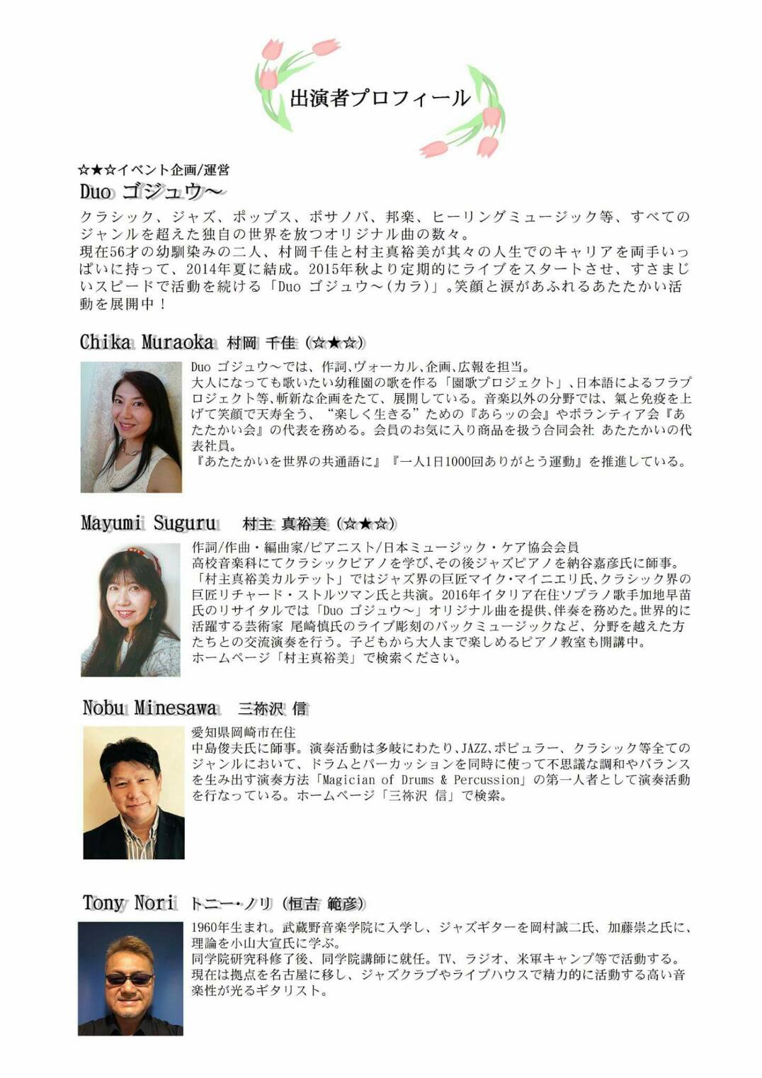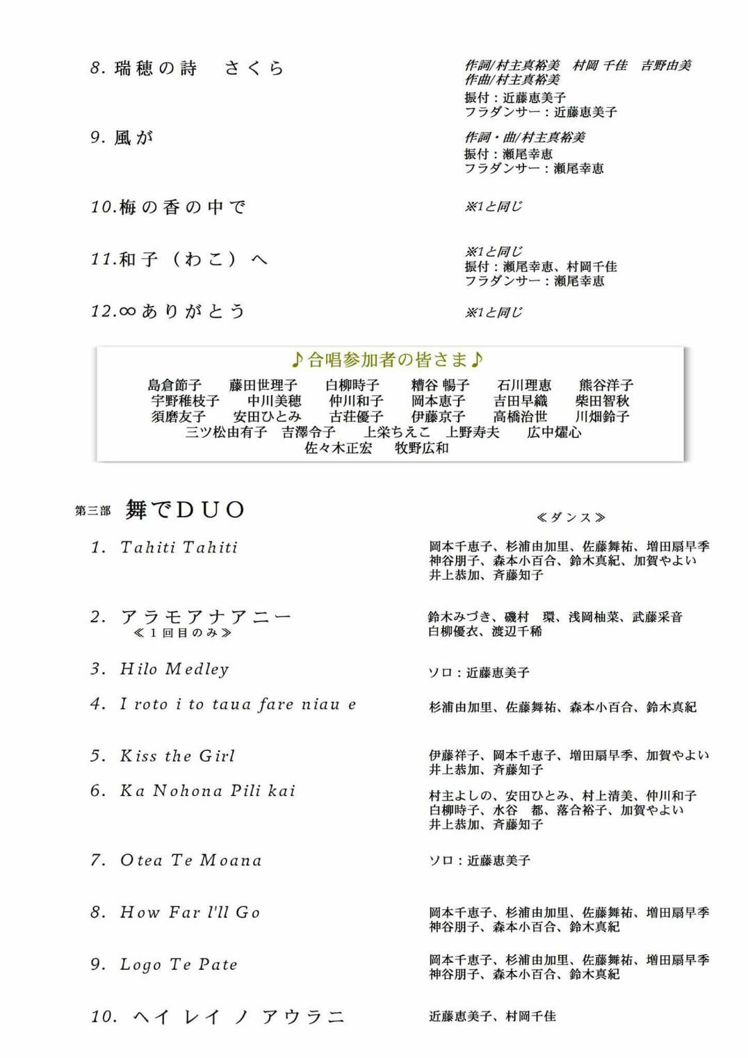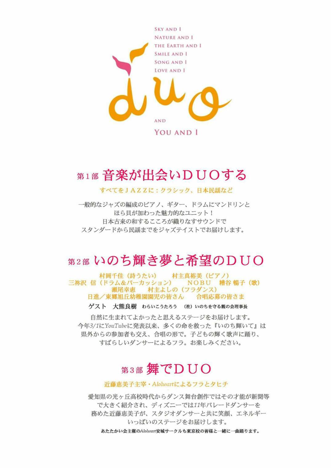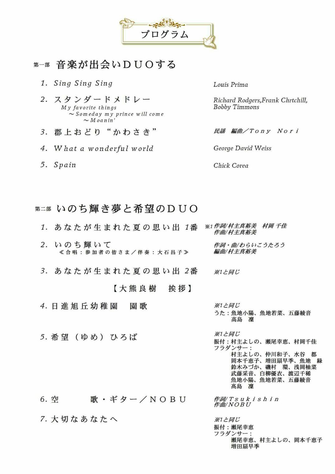 夢に向って突き進む姿は、美しいというより、汗臭く泥臭いものです。熱い情熱があればこその地道な作業。毎日が試行錯誤というより思考錯誤の連続。朝から晩まで走り回り、この思いを伝えていく根気などなど...鳥はシジュウカラ、女はゴジュウカラ、男はロクジュウカラと昭和36年生まれの幼馴染、村岡千佳と村主真裕美の二人が結成した"Duo ゴジュウ~" 今週の土曜日、19日に「2400人がつながってありがとう」の開演です。