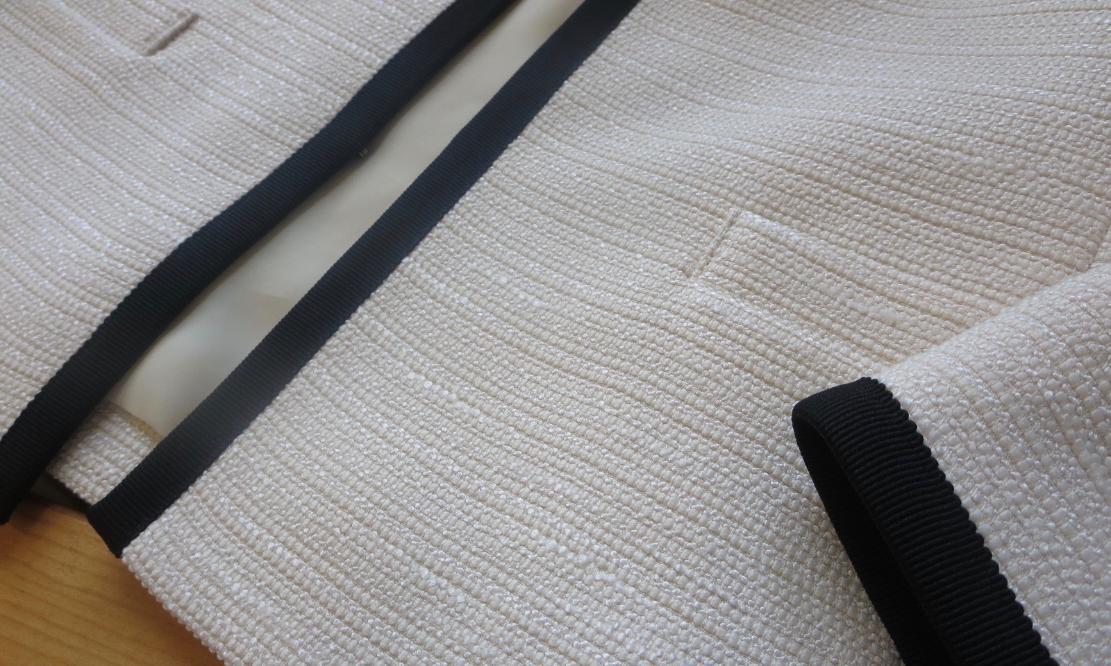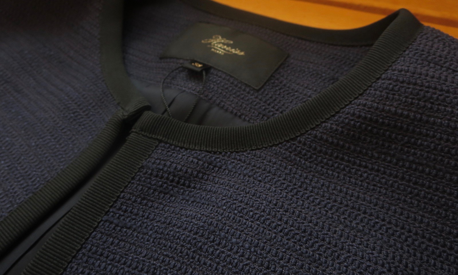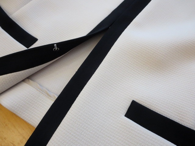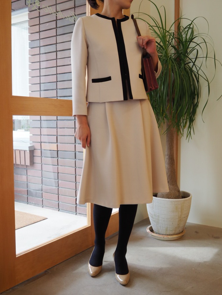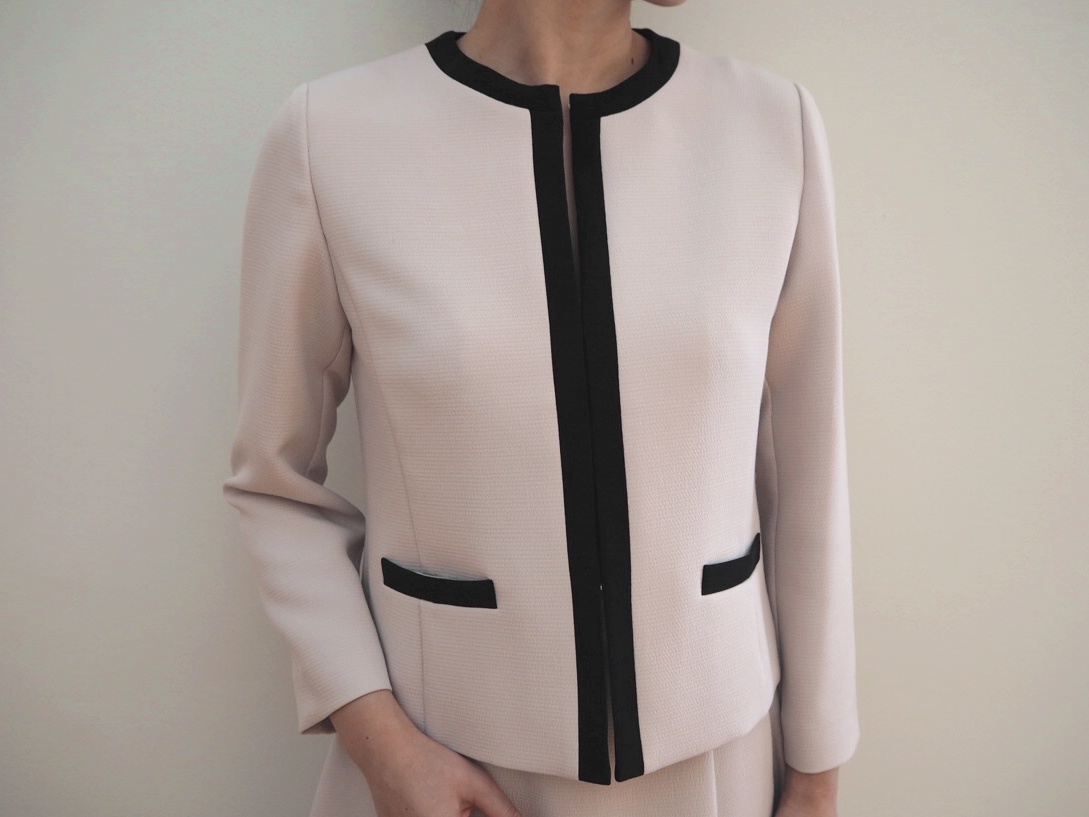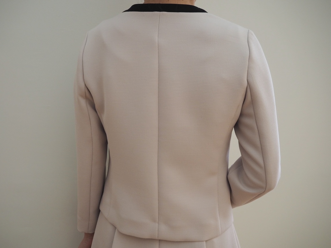 白に近い薄いベージュは優しい印象で、入学式などのセレモニーに最適です。衿周りから前立て、袖口部分の黒のパイピングで、柔らかな色目にアクセントと引き締め効果をもたらします。