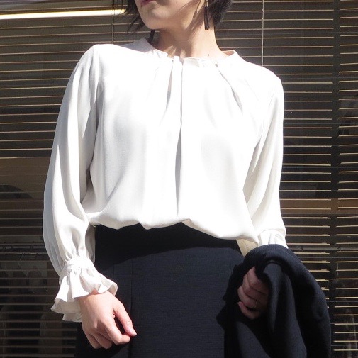 1月24日のブログでご案内したセットアップのインナーに合わせています。首元と袖口のフリルが、華やかさをプラスしてくれる落ち感のあるブラウスに仕上がっています。