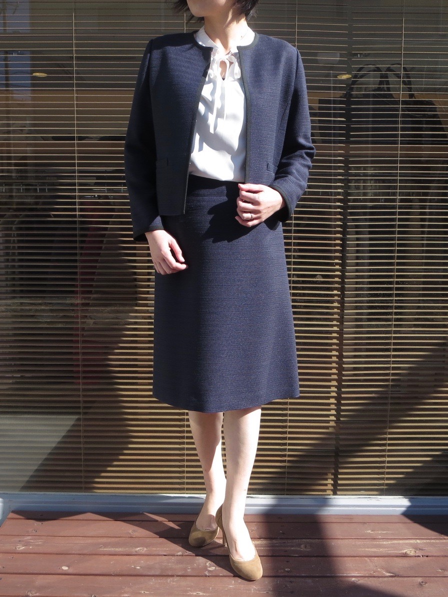 窓辺の日差しは暖かくてもまだまだ風冷えのする岡崎ですが、春本番を控えて、卒園式や卒業式に最適なセットアップが「Harriss」より入荷しました。いざ探そうと思うとなかなか見つけられないのですが、今回はセットアップと共にインナーに合わせていただくブラウスも一緒に届きましたので、ぜひお早めに検討してみてください。
