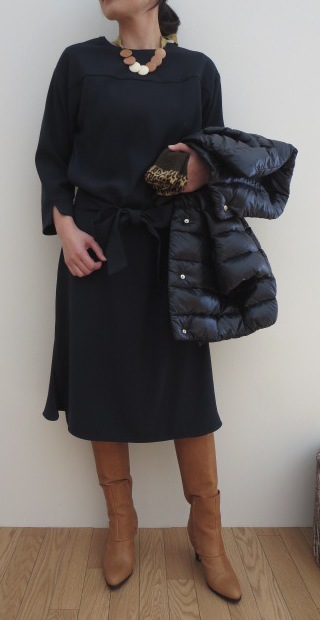 コートではなく、ダウンを羽織ってのお出掛けも新鮮です。ダウンでも高級ブランドHERNOの7分袖。質感とデザイン共に優れたこちらのモデルは、重ね着をしても袖がもたつかないし、グローブなどの小物をプラスする楽しみも。 そして、室内ではベーシックなワンピースが映えます。シンプルなシルエットですが、旬のこだわりがあるこちらのワンピースは未公開のHARRISS GRACE。シワになりにくいポリエステルですが、程良いハリ感のある少し厚手の生地なのでシルエットが崩れません。付属の共地リボンベルトで視線散らしつつ、引き締め効果も期待したいお勧めの1枚です。もちろんカジュアルにタートルネックをインにしたり、デニムをはいて頂いてもかっこよく着こなせます!