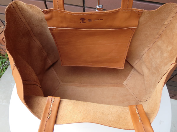 柔らかな革の風合いを楽しむ為、あえて裏地や金具をつけずに一枚仕立てにしています。なので、とても軽くて持ち易さもバツグンです。中には、ポケットが一つ付いています。