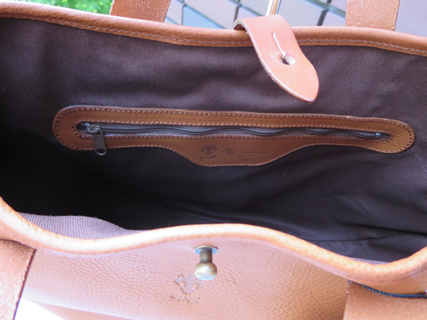 口が大きく開くので物が出し入れし易く、中はポケットが一つついています。