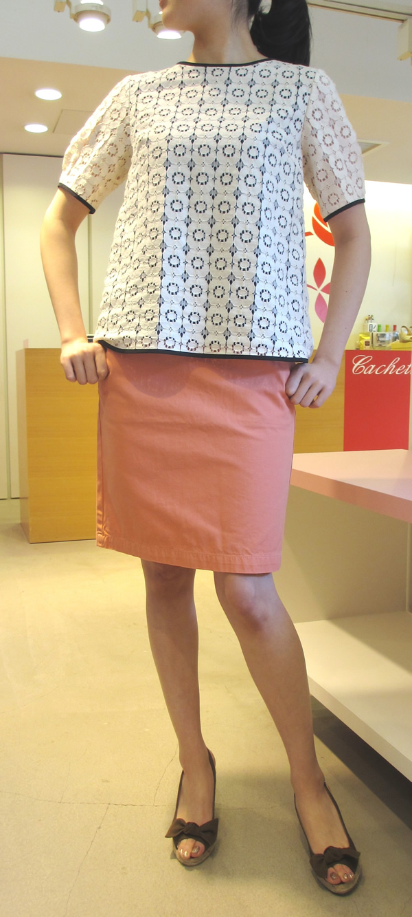 こちら同型のスカートを2通りコーディネートしてみました。左の可愛いピンクスカートは、この春人気のレースブラウスと合わせて上品でフェミニンな雰囲気に。右のベージュスカートは、チェックシャツで大人カジュアルに。