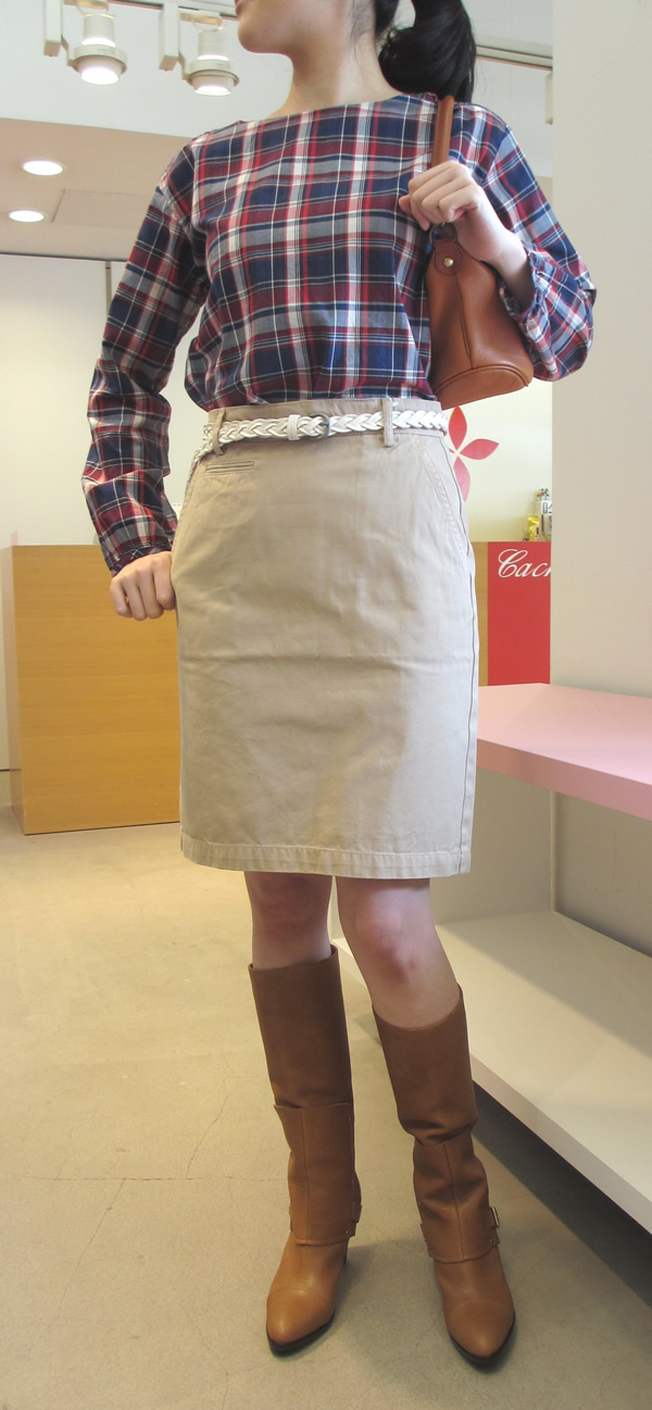 スカートは、上の写真の色違いです。キレイなオレンジ色なのでトップスには落ち着いた色のチェックシャツを、バックもホワイトで、全体を優しいトーンのコーディネイトにしてみました。