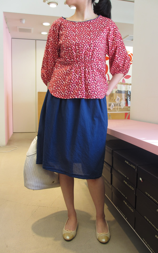 Tシャツのフィーリングを取り入れたプルオーバータイプのブルーシャツにシルクコットンのスカート、赤のバックでアクセントを加え、上品スタイルの完成!