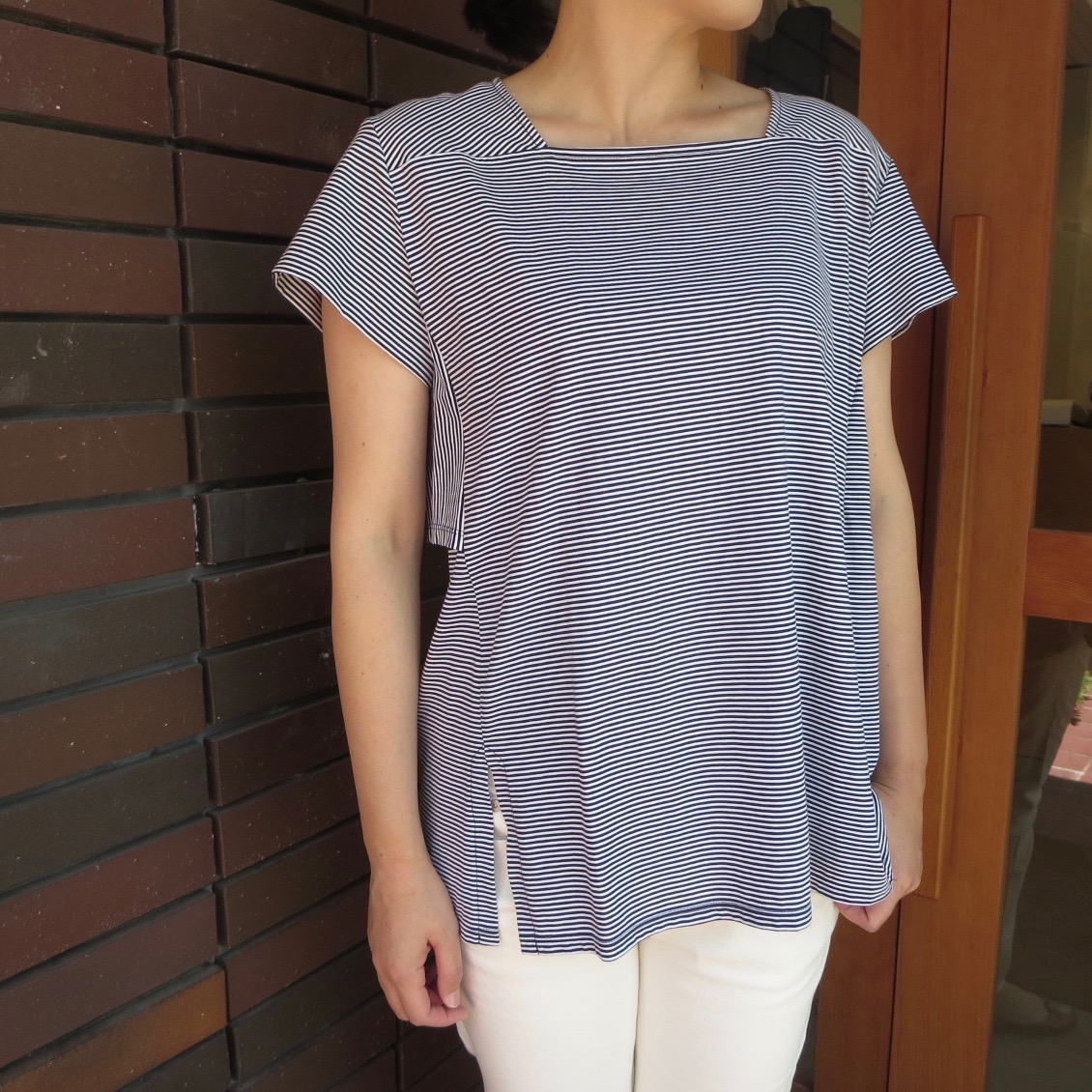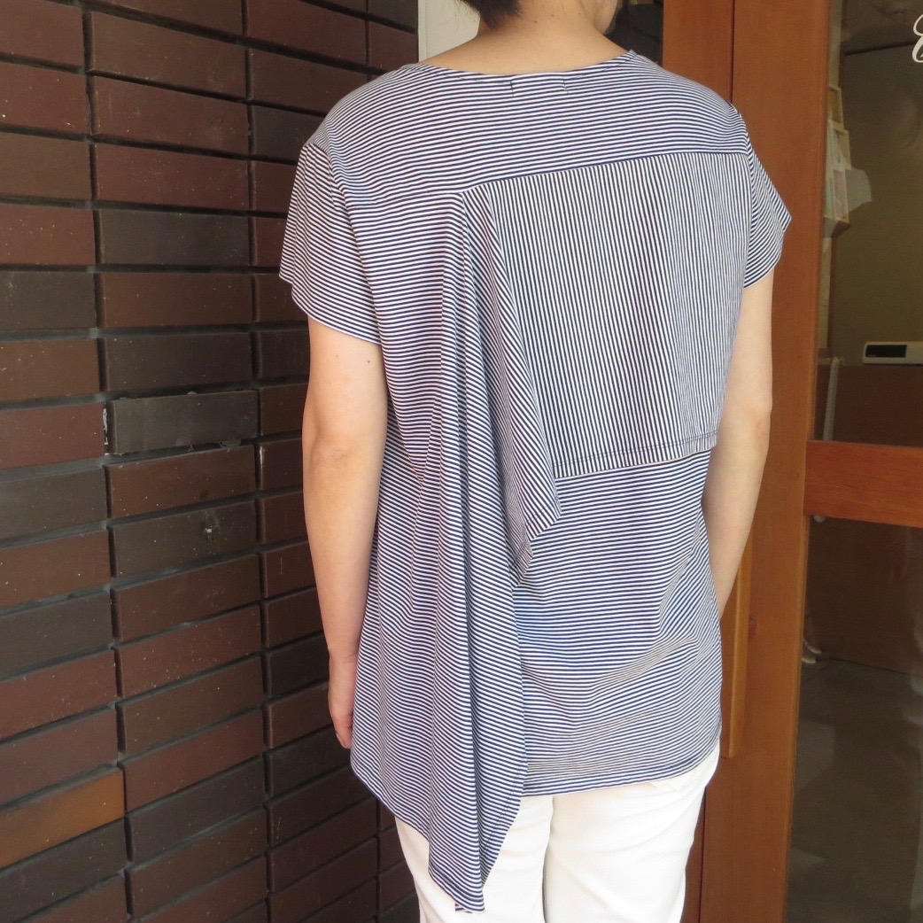 一番の魅力は、後ろ姿です。ボーダーを縦と横に使ったり、一箇所で摘んだようなデザインで動きを出したりと、他にはない素敵な一枚に仕上がっています。