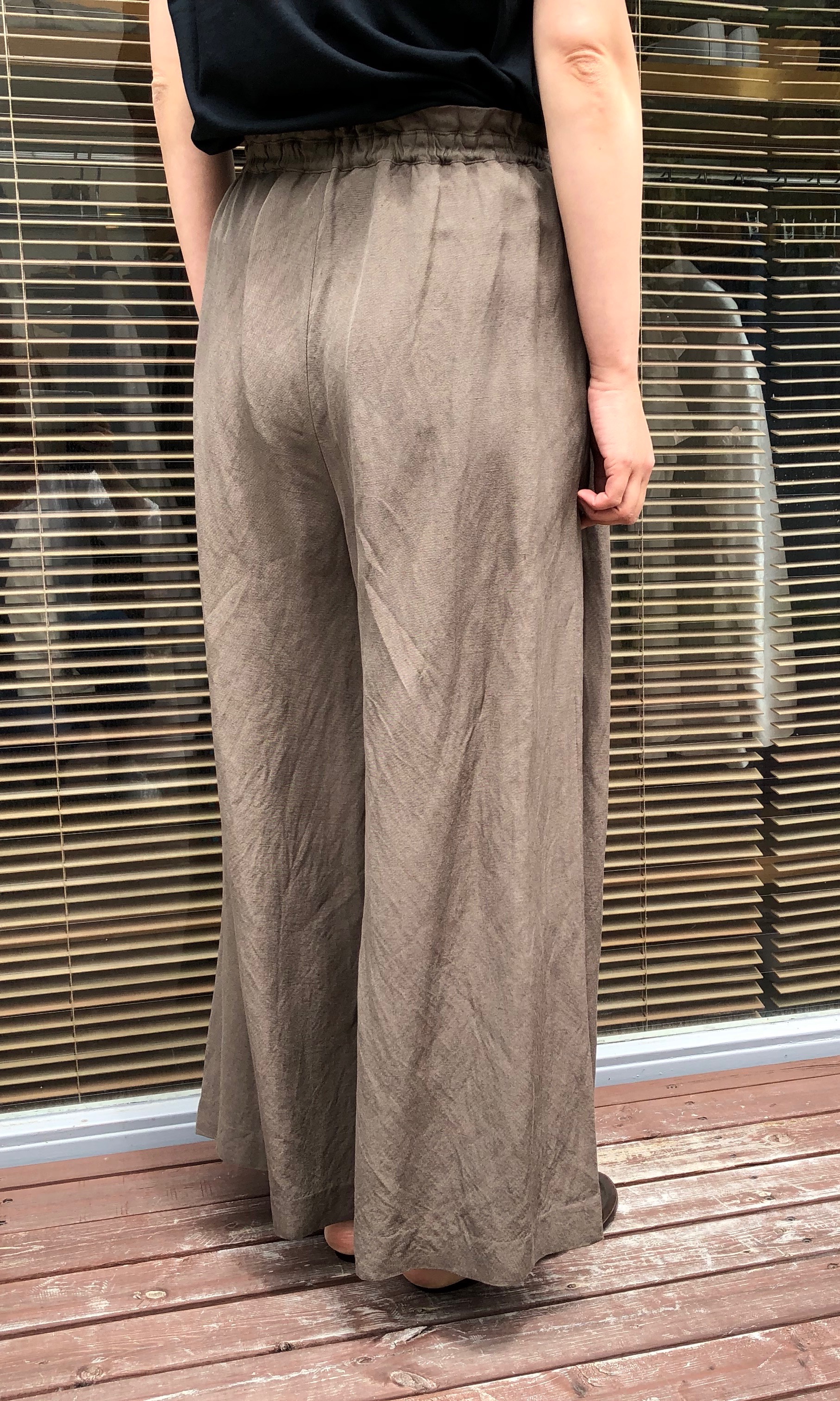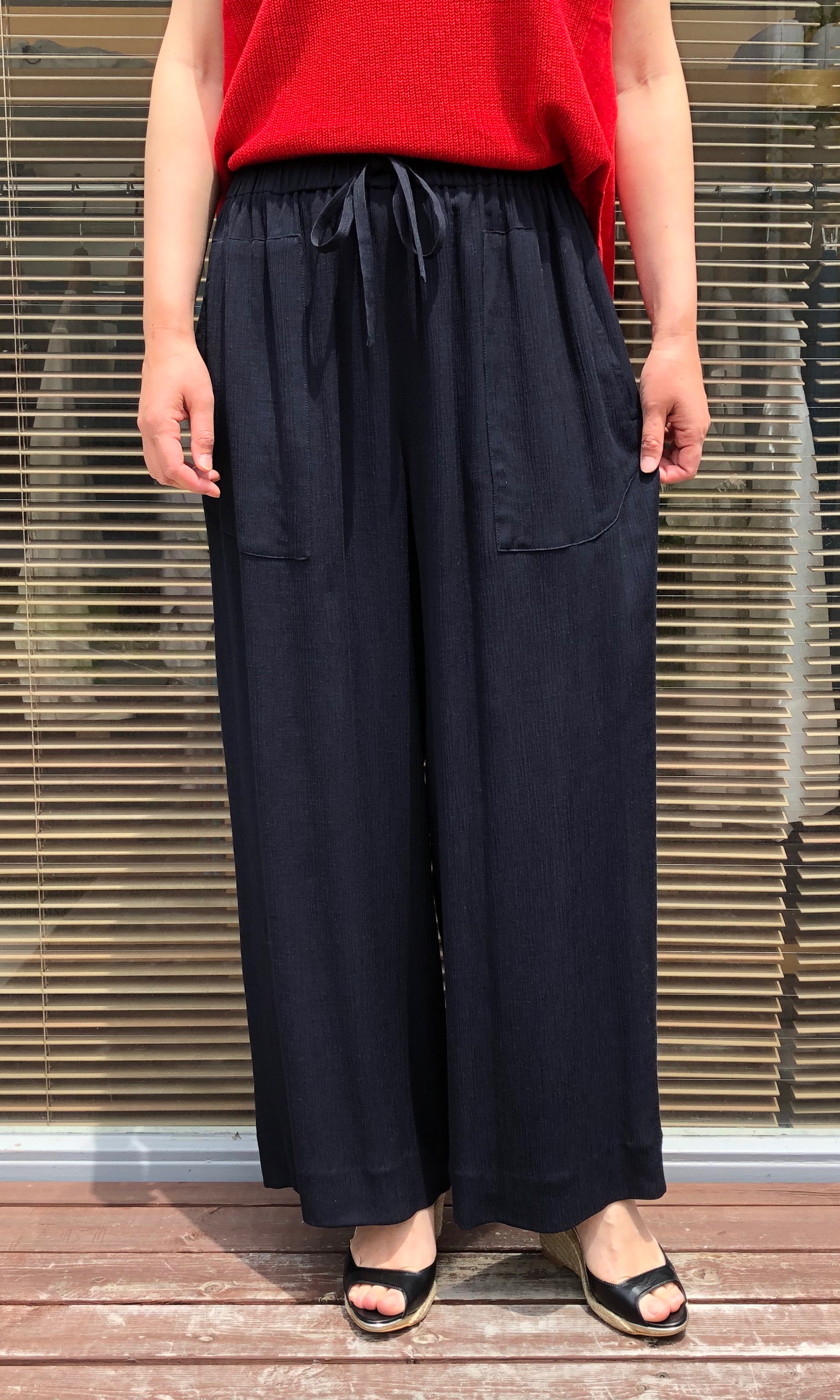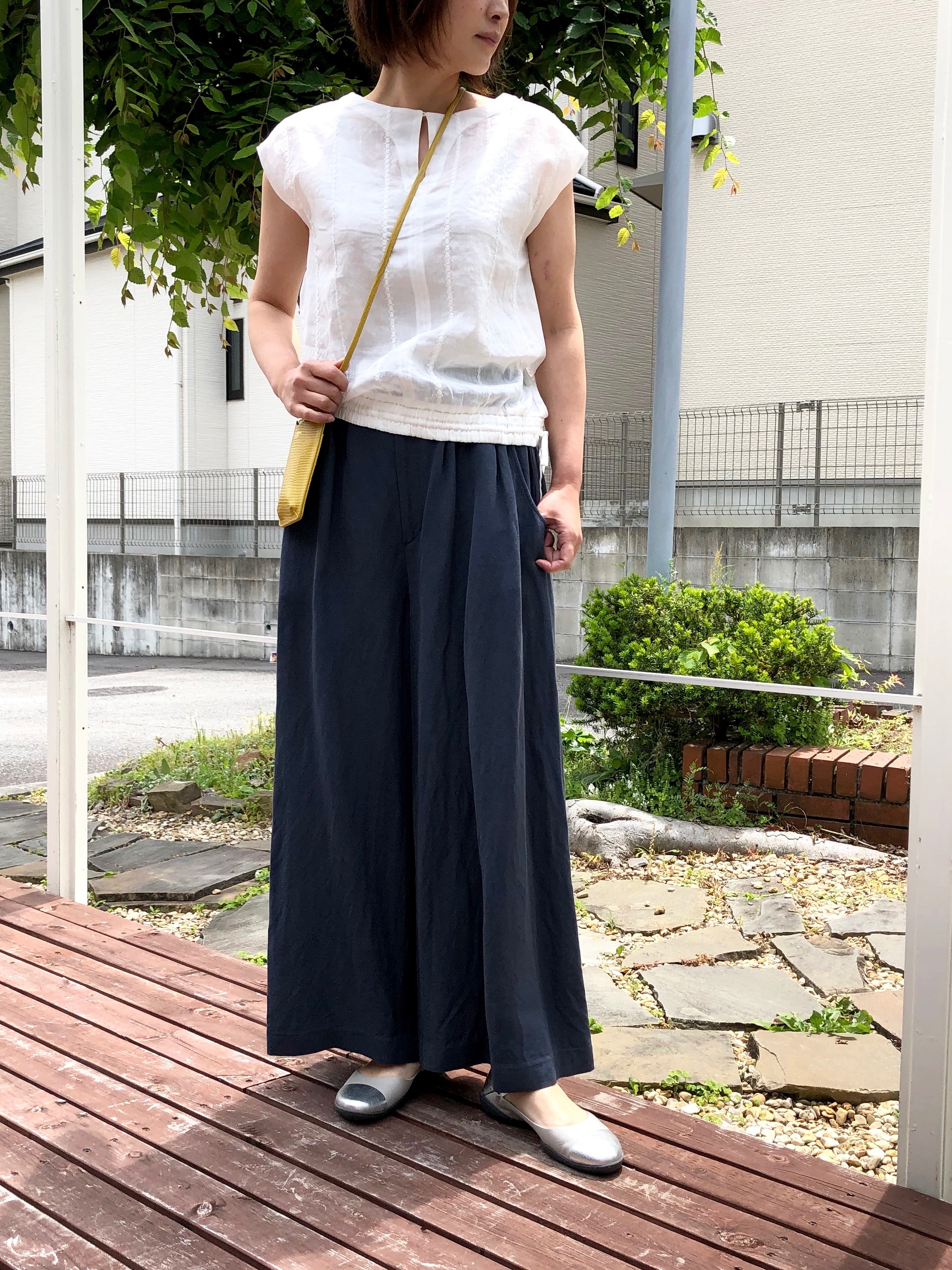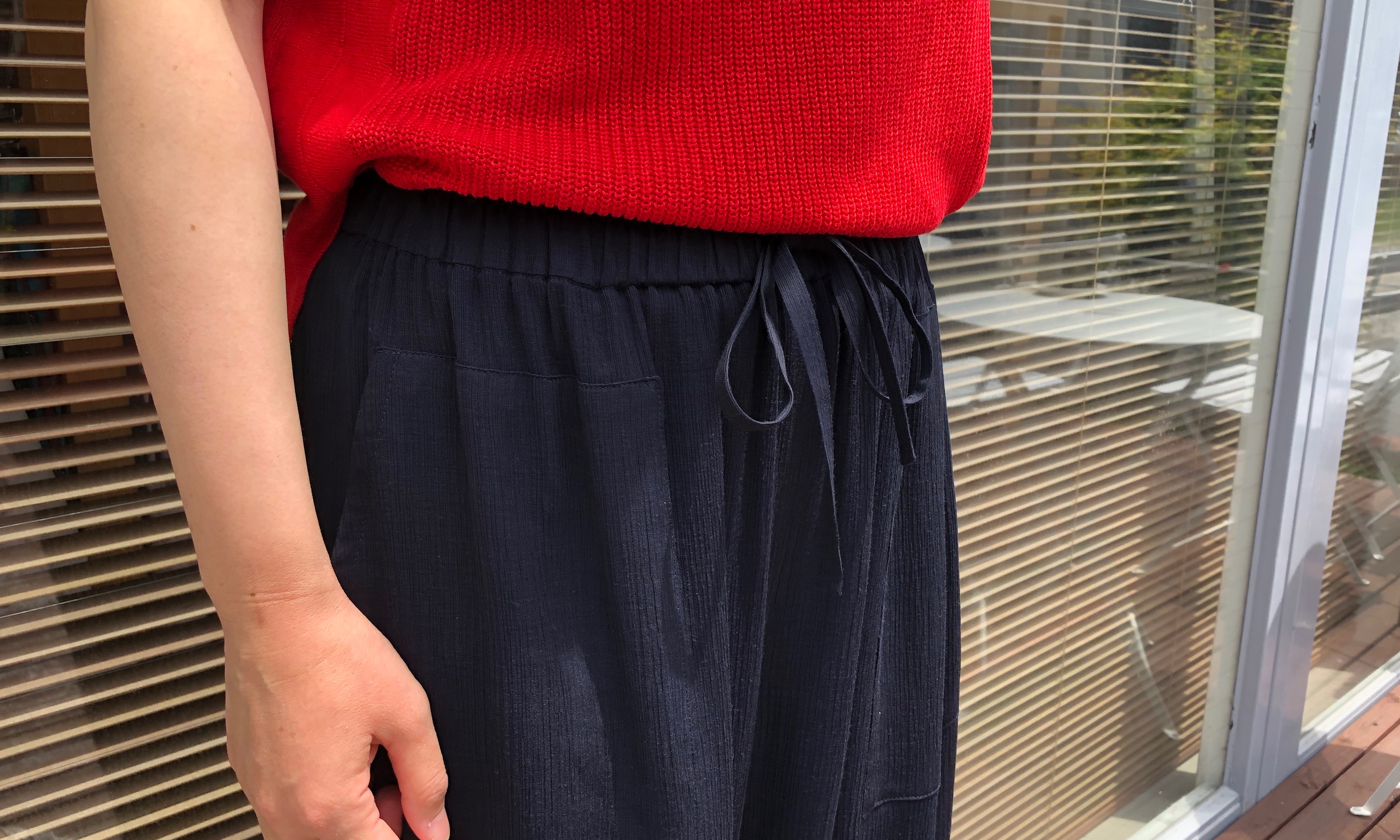 リネン×レーヨンで落ち感があり、穿いていても涼しく快適です。ウエストの後ろがゴムになっているので、窮屈感はゼロです。