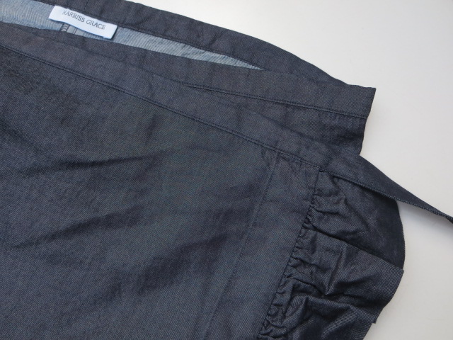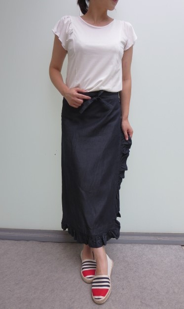 裾のフリルが、ポイントのデニム巻きスカート。カフェのギャルソン風のデザインは、クールで大人っぽい雰囲気です。濃いめのデニム生地で、大人可愛く着こなして下さい!足元がブーツでも素敵に決まりそうです。