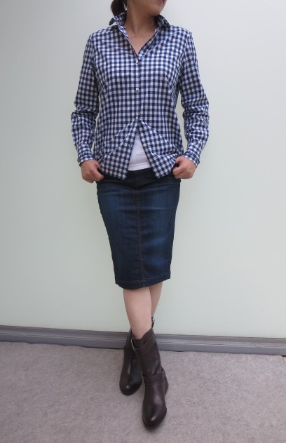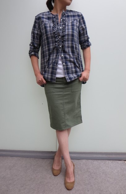 柔らかな肌触りが魅力のコットン素材を使用したチェック柄の長袖シャツ。前身頃のフリルと肩に付いた肩章がポイント。ボトムは、"heliopole"のペンシルスカートでコーディネイトしました。今シーズンのトレンドに【ミリタリーテイスト】がありますが、シャツの肩章やカーキ色のスカートなど旬な雰囲気もあって、良いカンジです。