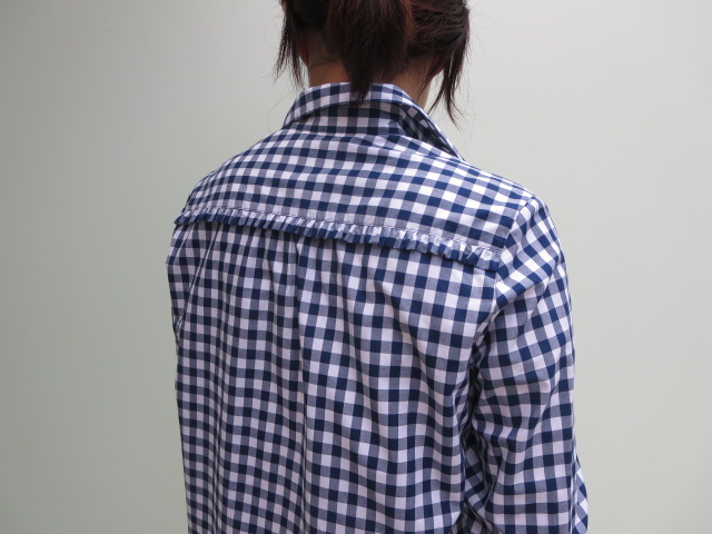 小振りな襟が、大人可愛いギンガムチェック柄のシャツ。少しハリのある生地感なので、キレイ目な雰囲気で着て頂けます。シンプルながら、袖口や後ろ身頃にさり気なく小さなフリルが付いていてなかなか凝った仕立てになっています。重ね着のシーズンには、チェック柄はポイント使いに重宝しますよ!