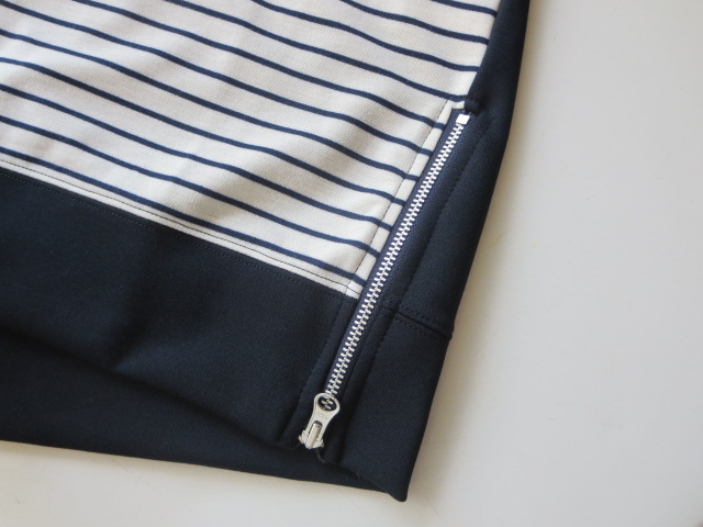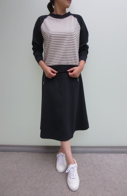 ジャージィ素材で楽ちんに着て頂けるセットアップはいかがですか?生地は、サラッと光沢感もあって、少しキレイ目な雰囲気に仕上がっています。トップスの脇の部分やスカートのポケットにファスナー使いのアクセントが施されています。スポーティですが、カジュアル過ぎないのが良いですね。