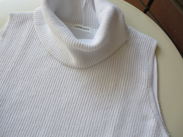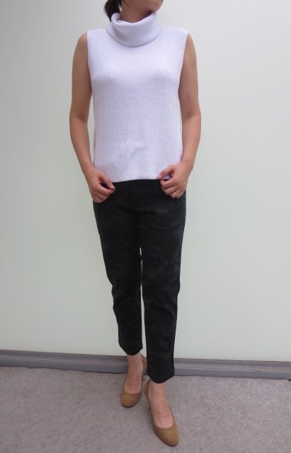 トップスは、柔らかなイタリアの糸で仕立てられたノースリーブのタートルニット。前後ろの編地が違っていたり、少しAラインシルエットになっているのが特徴です。重ね着のシーズンになったら、カットソーやシャツなどインに着て、ベストとして使っても◎。ボトムに合わせた迷彩柄パンツは、今シーズンのトレンドである【ミリタリーテイスト】にピッタリアイテム!ボーイフレンドシルエットと9分丈のバランスが旬な雰囲気です。