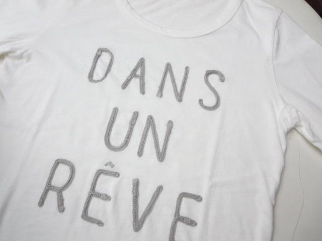 軽くて、少しハリのある生地感のロングシャツをデニムに合わせて、羽織り風にサラッと着てみました!カーキ色は、今年注目のカラー。ミリタリーのハードさはなく、シンプルで後ろにはキュッと結ぶリボン&小さなポケットが付いていて大人可愛らしい雰囲気で着て頂けます。中には、アクセントにロゴT。秋冬らしく少し起毛していて柔らかな肌触りです。"DANS UN REVE(夢の中) "と糸で縫い付けてあり、立体感あるデザインになっています。