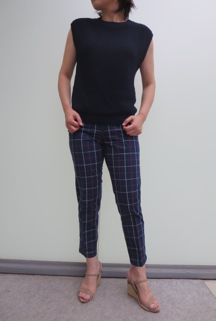 ノースリーブのTシャツやシャツなどスリーブレスが、近年人気ですが、ザックリと編んだニットも新鮮です!パンツに合わせても、女性らしく決まりますね。ボトムに合わせたチェック柄パンツも大人可愛い雰囲気で、ポイント使いに重宝しそう。スニーカーなどカジュアルな足元にも合わせやすい雰囲気です。