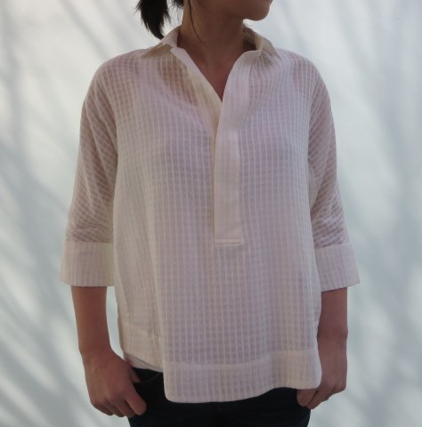 トップスに合わせたブラウスもご紹介します。ふんわりシルエットで、涼しげな雰囲気。無地ホワイトと下の写真のチェック柄の2種類あります。