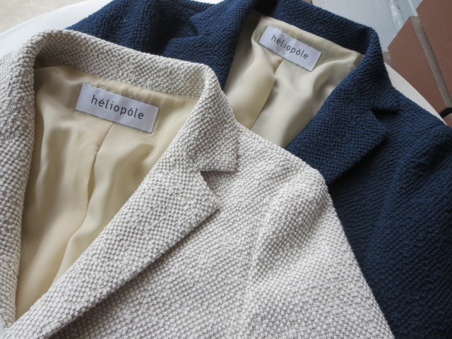 こちらは、ぷくぷくとした表情のあるニットライクなツィード生地が、特徴の"heliopole"のテーラードジャケット。ストレッチが効いているので、着心地は抜群!ソフトに仕上げることで、気負わずさらっと羽織れます。オンオフ問わずコーディネイト出来る万能ジャケットです!