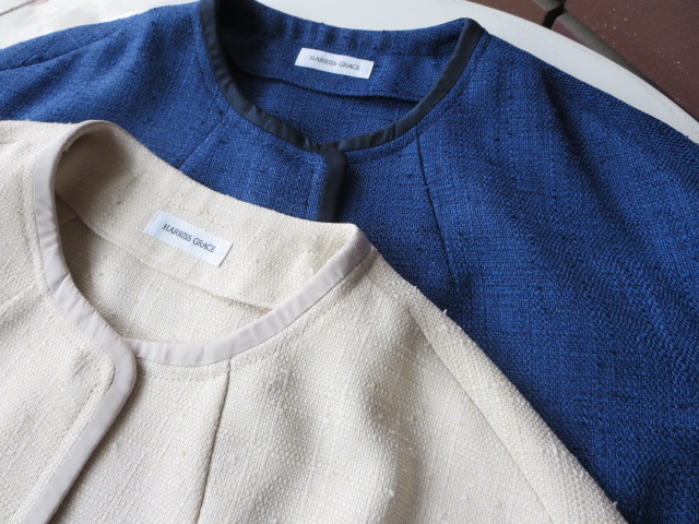 まずは、"HARRISS GRACE"から。さり気なく艶のある上質なツィード生地を使用したリッチ感漂うノーカラージャケットが入荷しました!少し裾にかけて広がったシルエットがふんわりと柔らかで、フェミニンな印象です。ボトムをデニムなどにして、カジュアルに着こなしてもお洒落に決まります。
