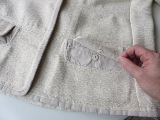 ネック回り・前立て・ポケット・袖口には、光沢感のある生地で縁どられ、上品な雰囲気。