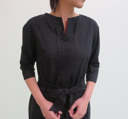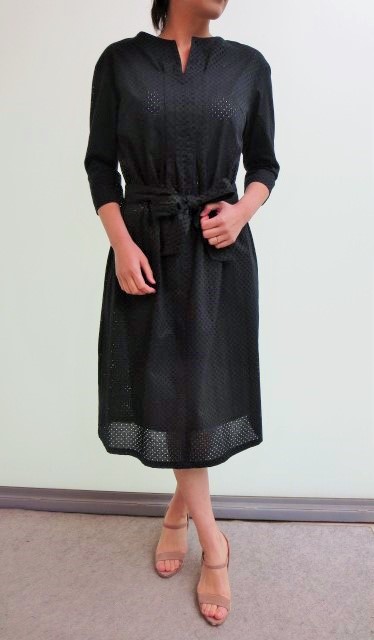 総レース柄のブラックワンピース。共布のリボンでウエストマークしても良し、そのままストンとシンプルに着ても良し。どちらでもシルエットをアレンジ出来るワンピースになっています。レースもドット柄のブラックというのもあって、大人っぽく上品に着て頂く事が出来ます。