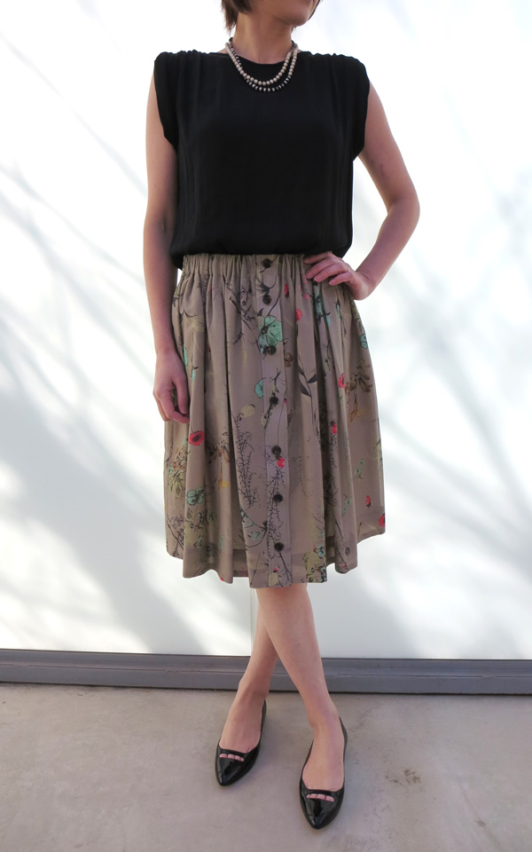 シーズンレスで使えそうなニュアンスのあるブラウス&軽やかで上質感のあるシルク混のプリントスカート。ブラウスは、カジュアル~お仕事までしっかりと使って頂けそうなカンジ。スカートは、アンティーク風のプリントが上品な雰囲気です。ウエストは、ゴム仕様なので楽ちんに穿けてGOOD!