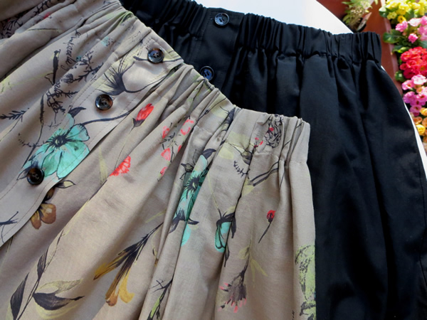 スカートは、プリント柄のL.ブラウンと無地のブラックの2色です。ふんわりとしたシルエットと前ボタンが、大人可愛い印象ですね!